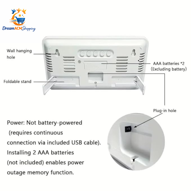Horloge digitale LED DS3826L avec grand affichage lumineux vert, facile à lire même à distance. Fonctionne par câble USB avec mémoire en cas de coupure (2 piles AAA). Installation murale ou sur bureau grâce au support intégré. Design moderne idéal pour maison, bureau ou magasin.